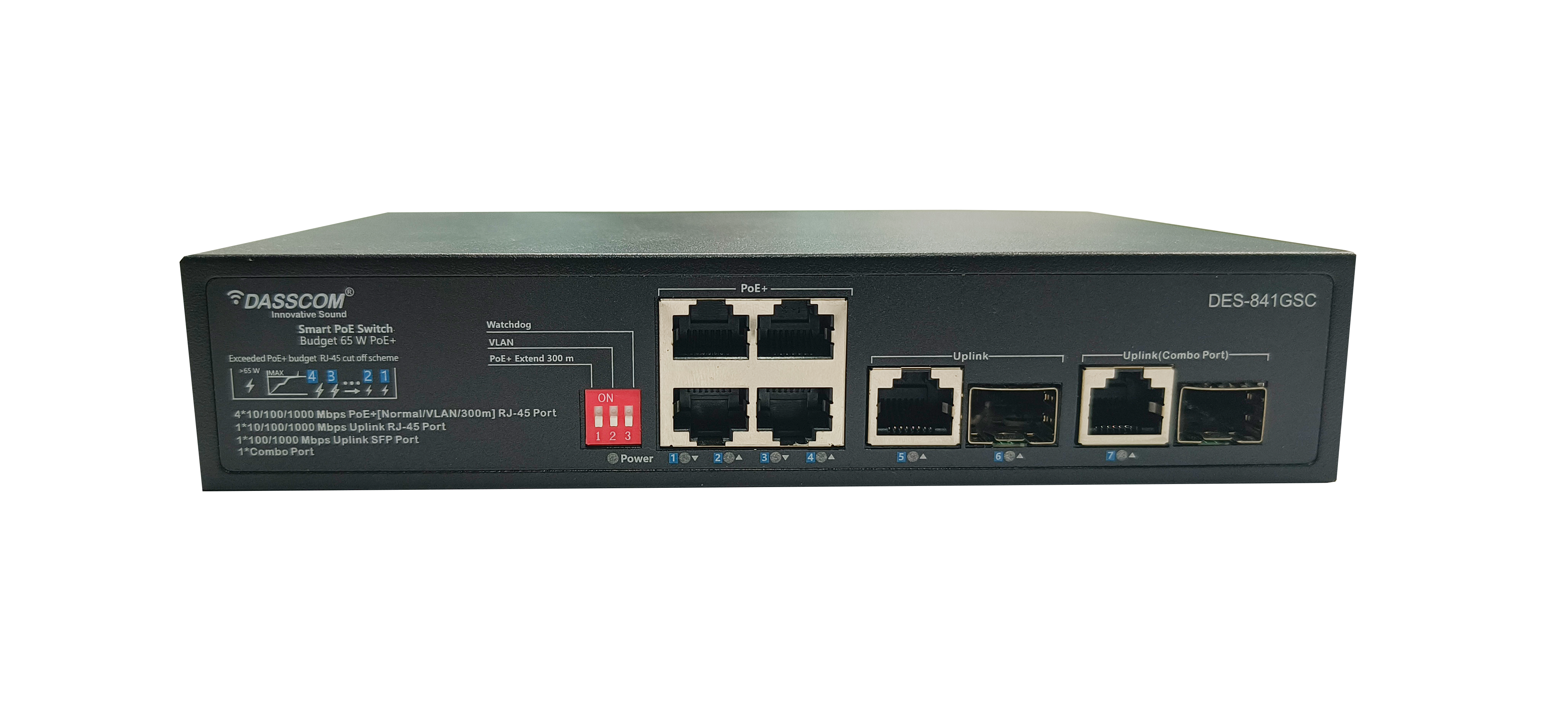The DES-R41GSC is a 7-Port Gigabit unmanaged PoE switch, designed for seamless power and data transmission. It features 4×10/100/1000M PoE ports, 1×Gigabit RJ45 uplink, 1×100/1000M SFP uplink slot, and 1×100M/1000M Combo uplink port. Supporting IEEE 802.3af/at standards, each PoE port delivers up to 30W, with a total PoE power budget of 65W. It intelligently detects and powers compatible devices like wireless APs, IP cameras, VoIP phones, and intercoms. Ideal for high-density network environments, the DES-R41GSC is perfect for hotels, campuses, dormitories, and SMBs, offering a reliable, cost-effective PoE networking solution with plug-and-play simplicity.