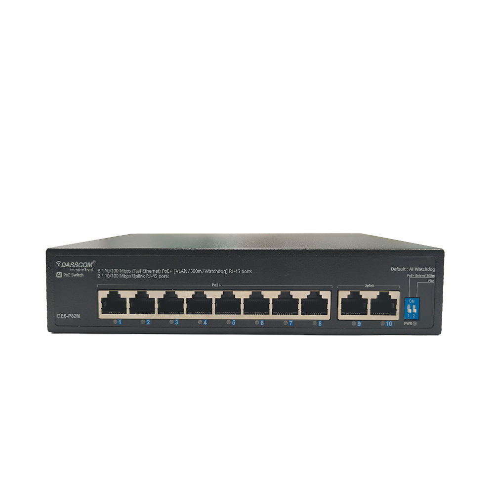 DES-P82M is an unmanaged 10/100M PoE switch featuring 8 PoE ports and 2 uplink RJ45 ports. Supporting IEEE 802.3af/at standards, each PoE port delivers up to 30W, with a total power output of 96W. It automatically detects standard-compliant devices and supplies power via Ethernet cables. Ideal for powering wireless APs, IP cameras, VoIP phones, and smart intercom systems, the DES-P82M ensures stable data and power transmission. Designed for high-density PoE environments, it is a reliable solution for hotels, campuses, factory dormitories, and small to medium-sized enterprises, offering simplified installation and efficient network expansion.