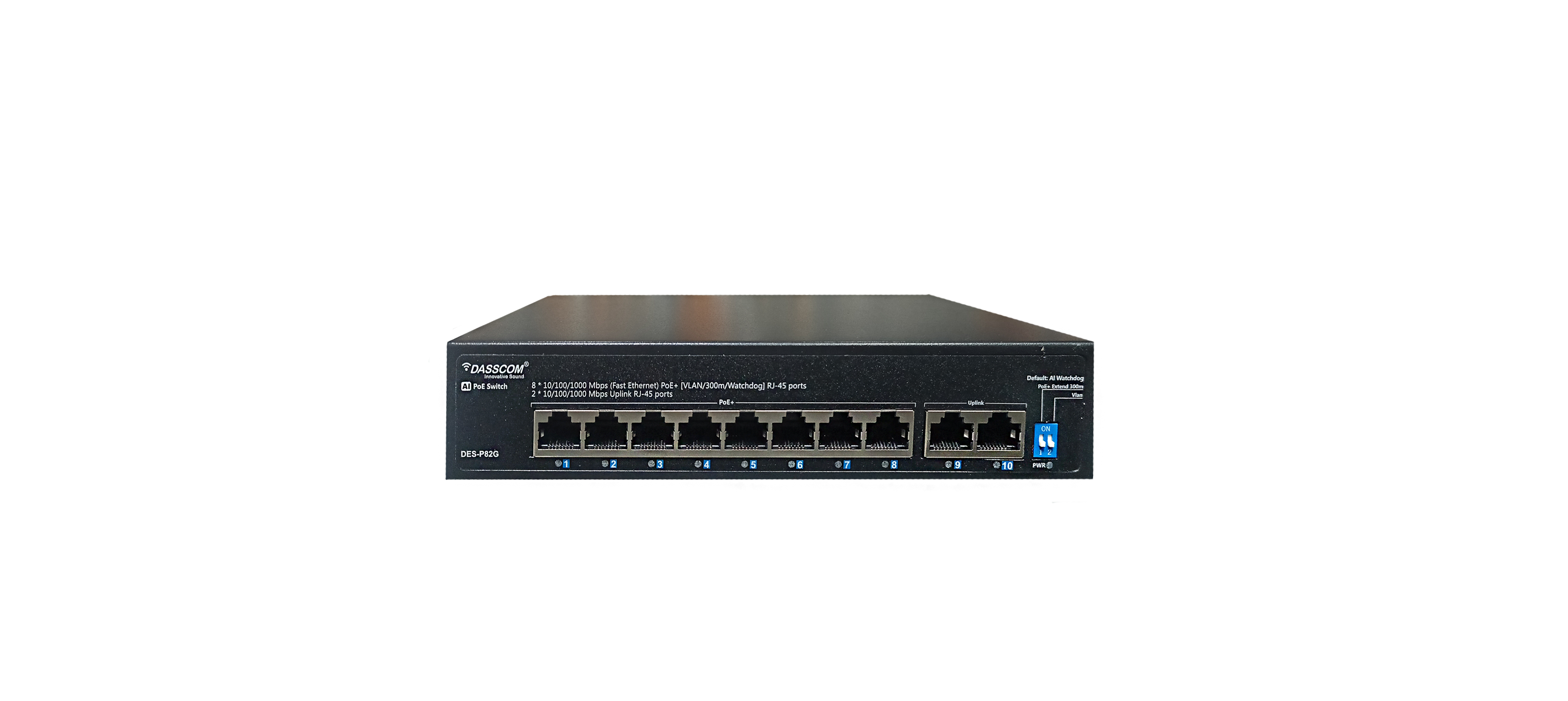 The DES-P82G is a Gigabit unmanaged Fiber PoE switch designed for high-performance networking and power delivery. It features 8×10/100/1000Base-T PoE ports and 2×1000M RJ45 uplink ports. Supporting IEEE 802.3af/at standards, each PoE port delivers up to 30W, with a total PoE budget of 120W. It intelligently detects standard-compliant devices and supplies power via Ethernet cable. Ideal for powering wireless APs, IP cameras, VoIP phones, and access control systems, the DES-P82G is perfect for hotels, campuses, hospitals, retail spaces, and SMEs requiring reliable, high-density PoE deployment in a compact and cost-effective solution.