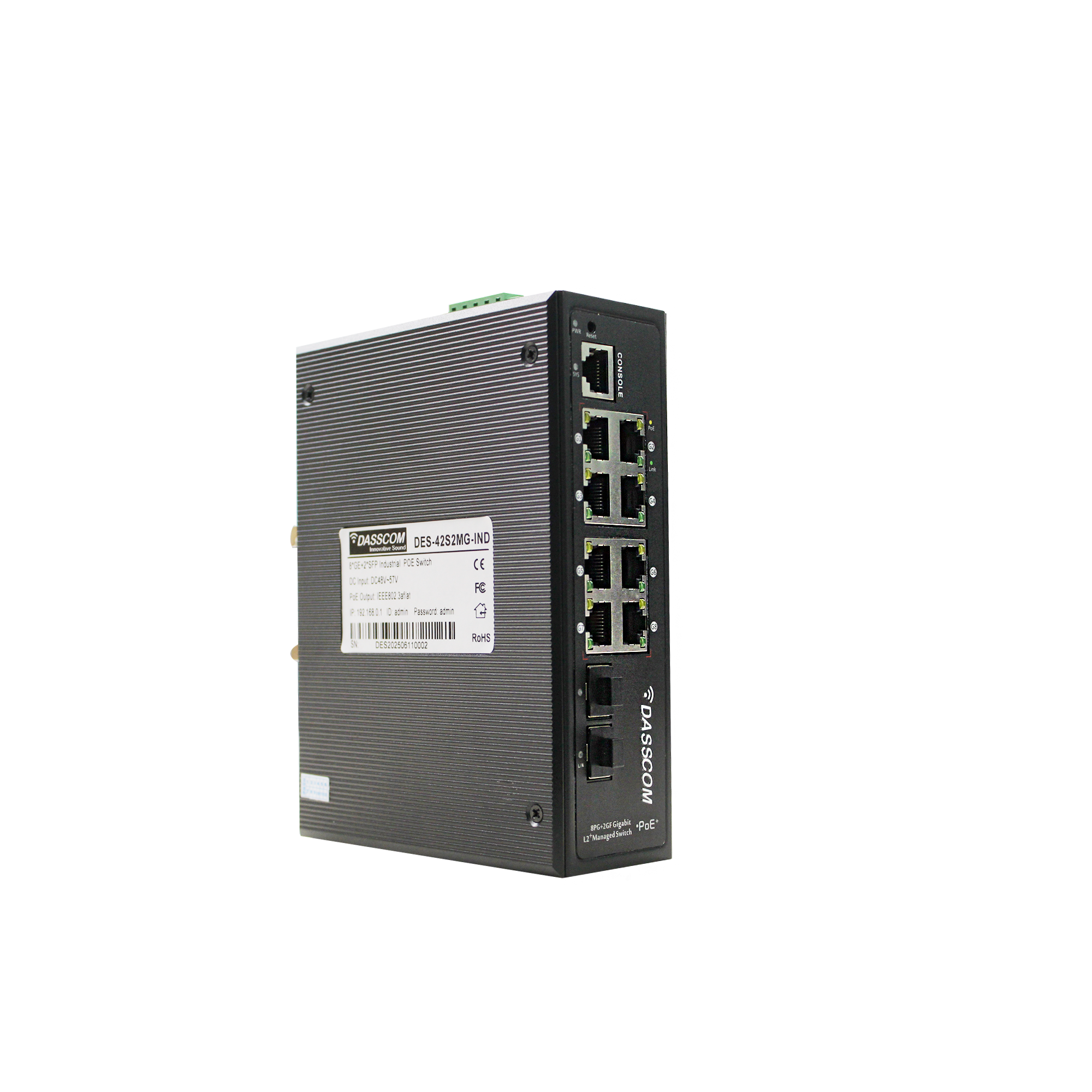 The DES-42S2MG-IND is a full Gigabit managed industrial PoE switch featuring 8×10/100/1000M PoE ports and 2×100/1000M SFP fibre slots. Supporting IEEE 802.3af/at, each PoE port delivers up to 30W, with a total PoE power budget of 120W (expandable to 240W). Engineered for harsh environments, it features an IP40-rated aluminium alloy housing for enhanced durability and heat dissipation. Ideal for intelligent transport, energy, mining, and automation, it offers rapid redundancy recovery (<50ms) with STP/RSTP/MSTP, and advanced network management via Web, CLI, and SNMP. The DES-42S2MG-IND ensures reliable, high-performance communication in demanding industrial settings.