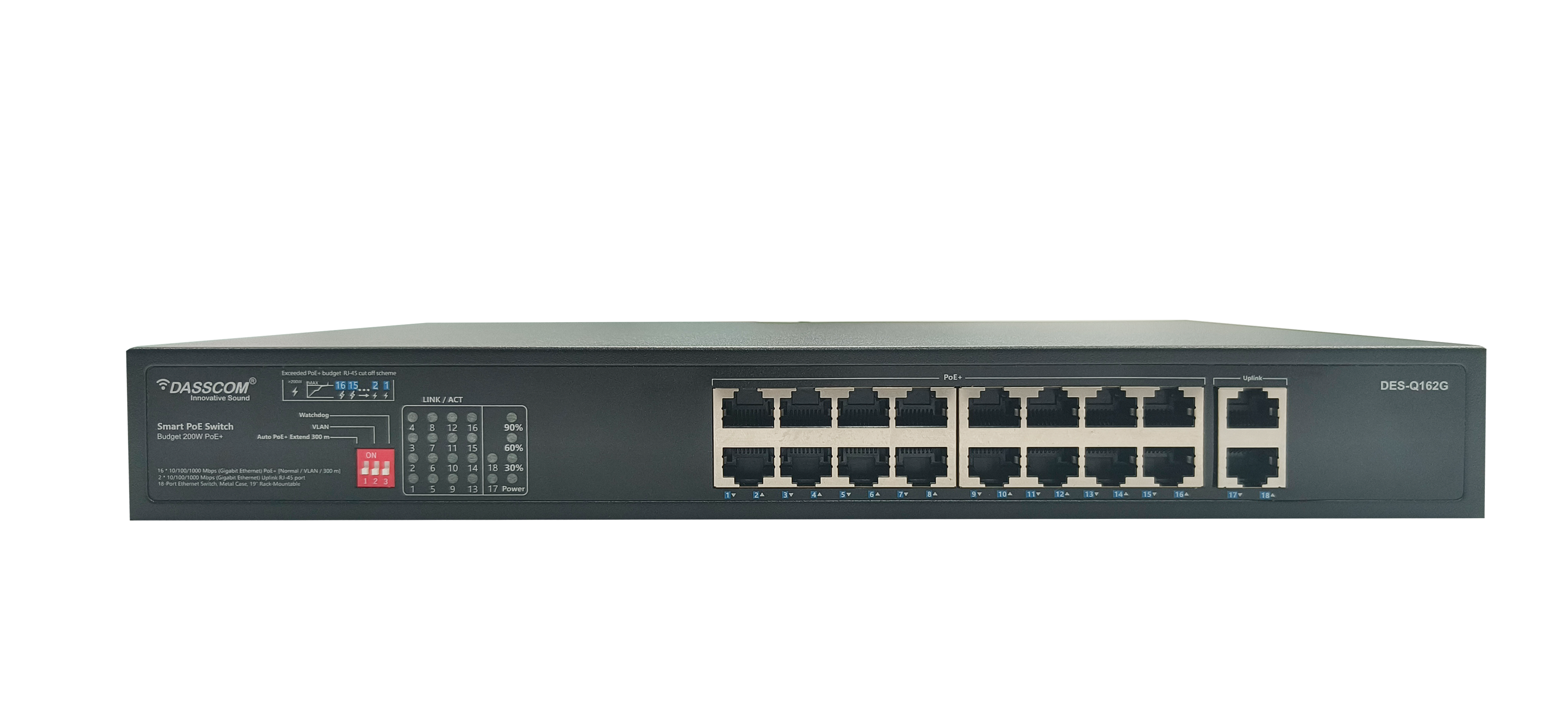 The DES-Q162G is a high-performance unmanaged PoE switch featuring 16 x 10/100/1000M PoE ports and 2 x 1000M uplink RJ45 ports. Supporting IEEE 802.3af/at standards, each PoE port delivers up to 30W, with a total PoE power budget of 200W. It automatically detects and powers compatible devices like wireless APs, IP cameras, VoIP phones, and video intercom systems via Ethernet cable. Designed for high-density PoE deployments, the DES-Q162G offers reliable data and power transmission, making it ideal for hotels, campuses, factory units, and small to medium-sized businesses seeking cost-effective and efficient network expansion without the need for complex configuration.